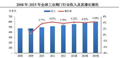 從中長期來看,影響閥門行業的下游行業擴張的主要因素,包括不斷增長的能源需求、全球人口的持續增加以及發展中國家的城市化、工業化進程并沒有因金融危機而發生根本性改變。目前全球各主要經濟體都已經進入經濟復蘇周期(根據國際貨幣基金組織的統計和預測數據,2010年、2011年和2012年全球經濟增長實現恢復性增長,增長率分別為5.3%、3.9%和3.2%,2013年和2014年全球經濟年增長速度預計為2.9%和3.6%)。閥門行業自2010年也開始走向復蘇,根據McIlvaine的調查和預測數據,2010年、2011年和2012年,全球工業閥門行業收入分別為492.24億美元、513.17億美元和532.61億美元,增長率恢復至3.77%、4.25%和3.79%,2013年-2015年全球工業閥門行業的預計銷售增長率將分別達到4.22%、4.05%和4.36%,呈現穩步上升的增長態勢。