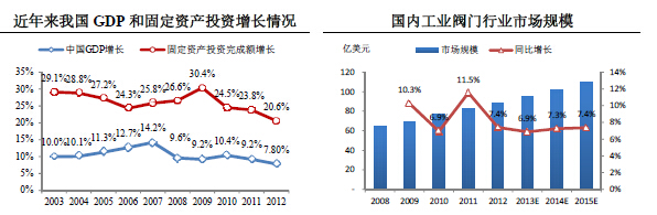 2003年-2012年,中國經濟總體上保持快速增長的發展態勢,平均GDP增長率為10.45%,全社會固定資產投資完成額增長率平均為26.11%。國內閥門行業整體上保持持續增長的態勢,景氣程度高于全球水平。2008年全球金融危機爆發后,國內閥門行業增速下滑,但在2010年又恢復到較高的增長水平。根據McIlvaine的分析,預計2013年至2015年,中國工業閥門行業市場規模的增長率還將穩定在7%左右,遠高于全球的工業閥門行業增長速度。